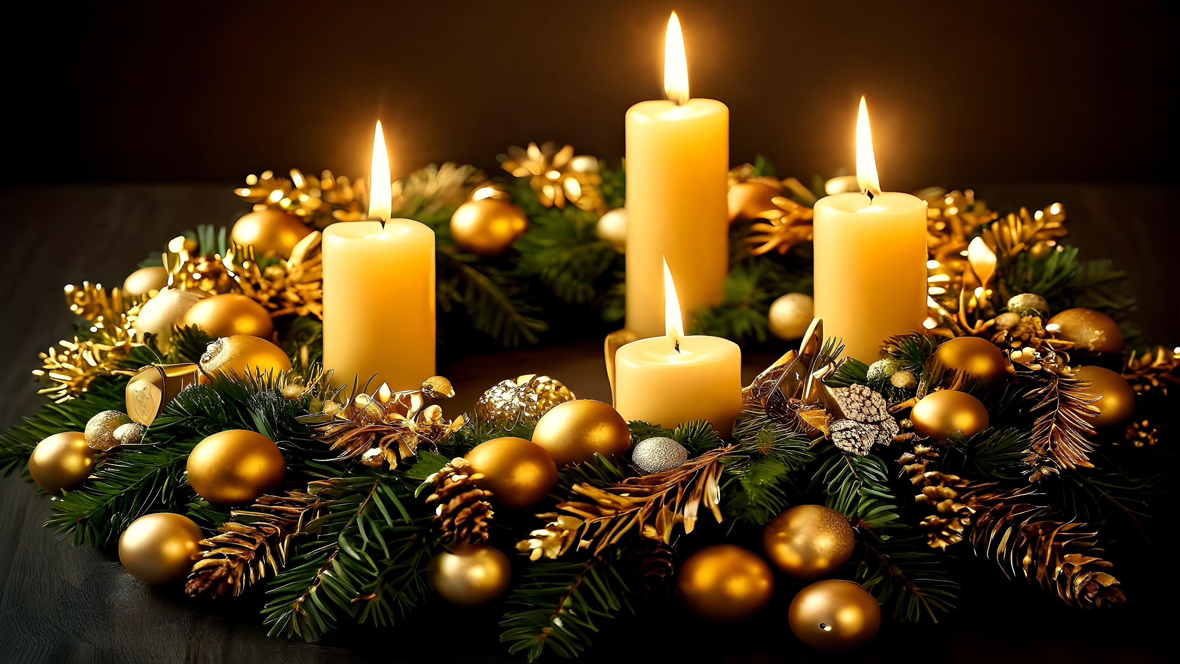 Weihnachkugeln, Adventskranz, Mistel Zweige, Lichterketten, Frohe